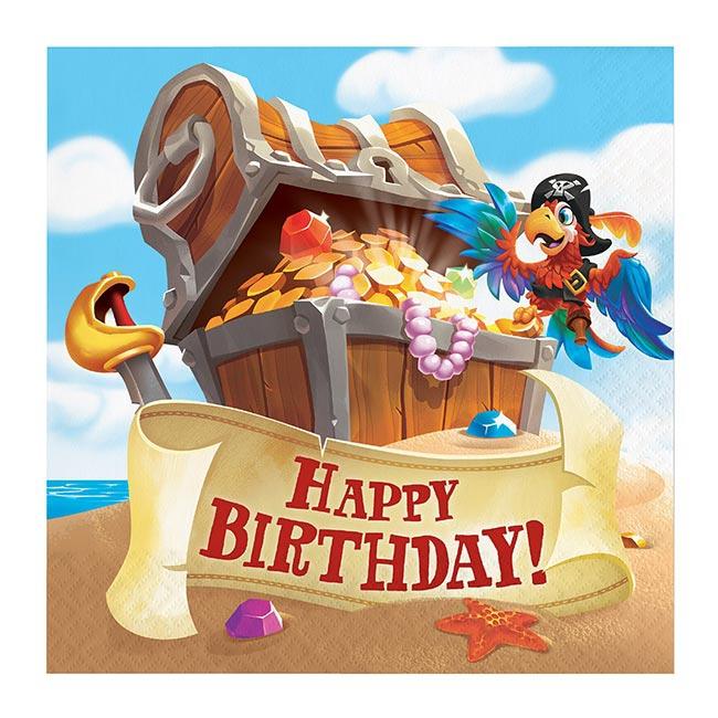Die Servietten dieser Serie "Piraten auf großer Fahrt" werden im 16er Pack geliefert. Sie sind aus 2-lagigem Papier gefertigt und am Rand geprägt. Gefaltet haben Sie ein Maß von ca. 16,5 x 16,5 cm. Sie sind bedruckt mit einer Schatzkiste und einem Papagei, sowie dem Schriftzug Happy Birthday.