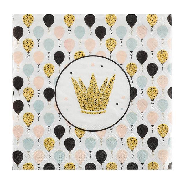 Die Servietten "Sparkling Celebration" werden im 20er Pack geliefert. Sie haben einen geprägten Rand und sind dreilagig. Der Druck zeigt in der Mitte eine Krone und Sternchen, der Rest der Serviette ist mit Ballons in Schwarz, Hellblau und Rosa bedruckt. Die Krone, als auch einige der Ballons, sind so bedruckt das er Eindruck von goldenem Glitzer erweckt wird. Gefaltet sind die Servietten ca. 16,5 x 16,5 cm lang, entfaltet ca. 33 x 33 cm.