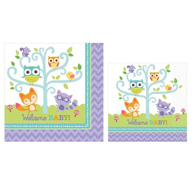 Die Servietten "Süße Waldbewohner" bestehen aus Papier und werden im 16er Pack geliefert. Sie sind aufgefaltet ca. 33 x 33 cm oder ca. 25 x 25 cm groß (je nach Auswahl). Bedruckt sind sie mit niedlichen Bewohnern des Waldes und der Aufschrift "Welcome Baby!".