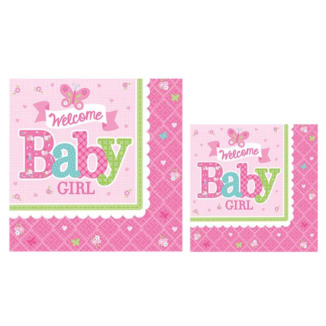 Die Servietten "Willkommen Kleines" werden im 16er Pack geliefert. Sie sind 2-lagig und es kann zwischen den Größen ca. 33 x 33 cm und ca. 25 x 25 cm gewählt werden. Die Servietten sind rosa und mit dem Satz "Welcome Baby Girl" bedruckt.