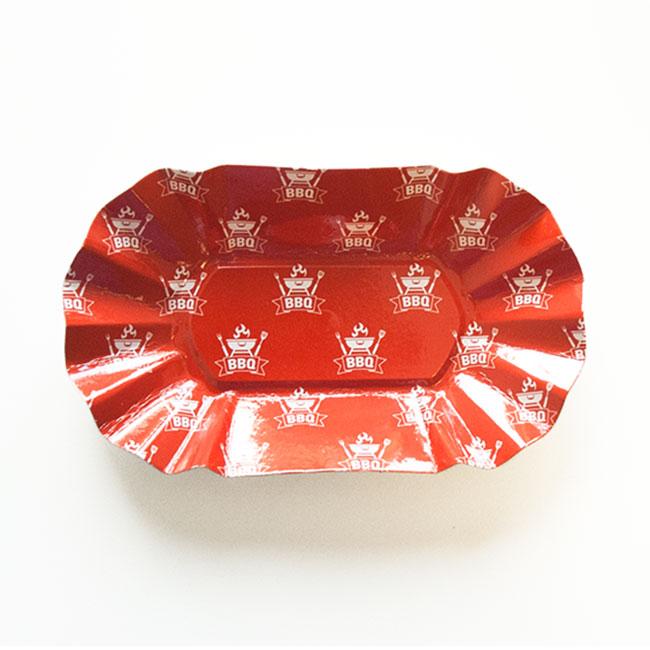 Die Snack-Teller "BBQ Time" werden im 8er Pack geliefert. Sie sind überwiegend rot und mit vielen weißen Grills bedruckt, unter denen der Schriftzug "BBQ" zu lesen ist. Die Einweg-Pappschalen haben eine Länge von ca. 16,5 cm und sind ca. 10 cm breit.