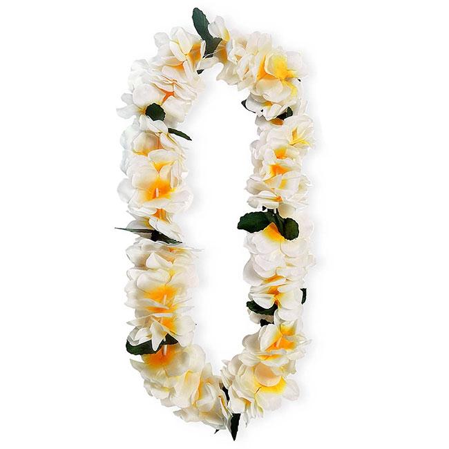 Diese sommerliche Blumenkette "Hawaii" besteht aus großzügig aneinandergereihten Blumen in der Farbe Weiß und Orange. Zwischendurch wurden einige grüne Blätter hinzugefügt, um der Blumenkette etwas Charme zu verpassen. Die Blumenkette wird einfach um den Hals gelegt und sieht super zu vielen sommerlichen Kostümen aus.