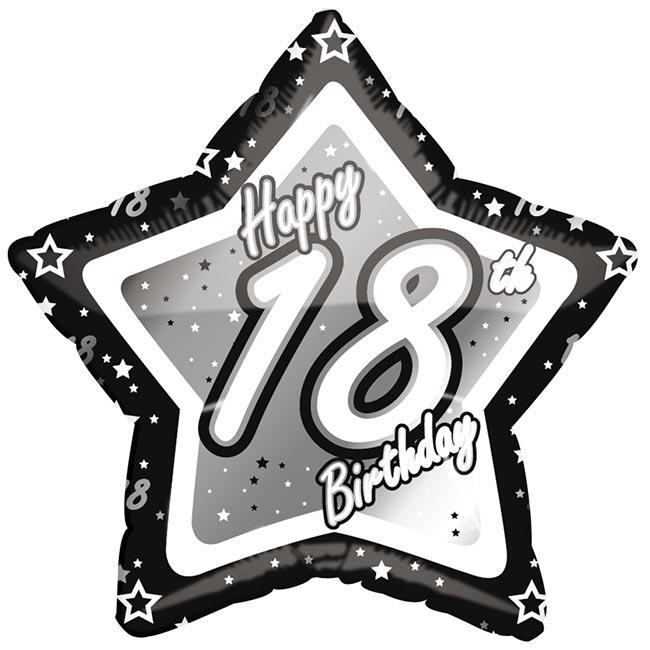 Dieser edle Ballon in sternförmigem Design besteht aus dünner Folie. Er kann mit Luft oder Helium befüllt werden. Sein Durchmesser beträgt ca. 45 cm. Auf dem metallic-silber und weißen Untergrund prangt der Geburtstagsgruß "Happy 18th Birthday". Der Ballon ist überall mit kleinen Sternen in Silber verziert. Beidseitig bedruckt.