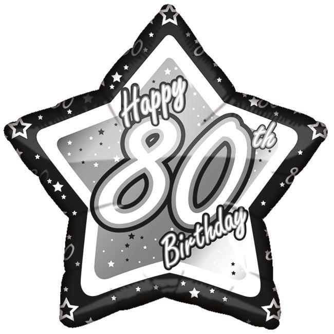 Dieser tolle Ballon in Sternform besteht aus dünner Folie und kann mit Helium oder Luft gefüllt werden. Der Durchmesser beträgt ca. 45 cm. Das Motiv ist edel in metallic-silber, weiß und schwarz gehalten. In der Mitte steht die Aufschrift "Happy 80th Birthday". Über dem Ballon verteilt sind kleine Sterne aufgedruckt. Der Druck ist beidseitig.
