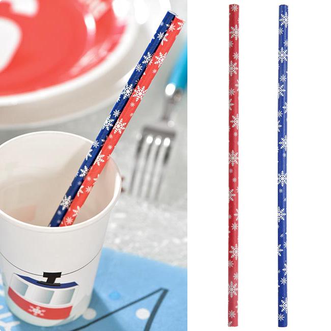 Die Strohhalme "Schneeflocken" werden im 20er Pack geliefert und bestehen aus Pappe. Sie haben einen Durchmesser von ca. 0,6 cm und sind ca. 19 cm lang. Je nach Auswahl sind sie entweder blau oder rot und mit weißen Schneeflocken verziert.