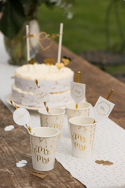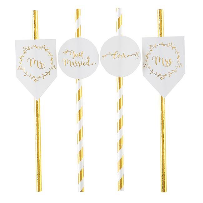Die Strohhalme "White Wedding" bestehen aus Papier und werden im 8er Pack geliefert. Jeder Strohhalm ist ca. 19,5 cm lang und jeweils noch mit einem einseitig bedruckten Motiv aus dünner Pappe verziert. Der metallisch Goldene Look der Strohhalme und der Schrift auf den Motiven, bilden hier einen ganz besonderen Eyecatcher. Vier Strohhalme sind durchgehend golden verziert und haben als Motiv in Wimpel Form (ca. 4,5 x 6 cm) jeweils „Mr“ und „Mrs“. Die vier gestreiften Strohhalme haben ein rundes Motiv (ca. 4,5 cm) mit den Aufdrucken „Love“ und „Just Married“.