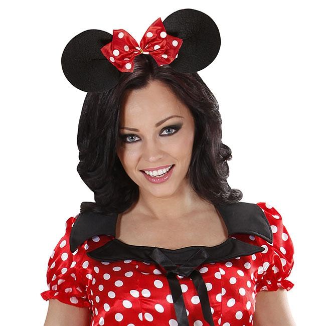 Die Mausöhrchen sind schwarz und sitzen auf einem ebenfalls schwarzen Haarreif. Mittig der Ohren befindet sich eine rote Fliege mit weißen Punkten. Der Durchmesser eines Ohres beträgt ca. 13 cm.