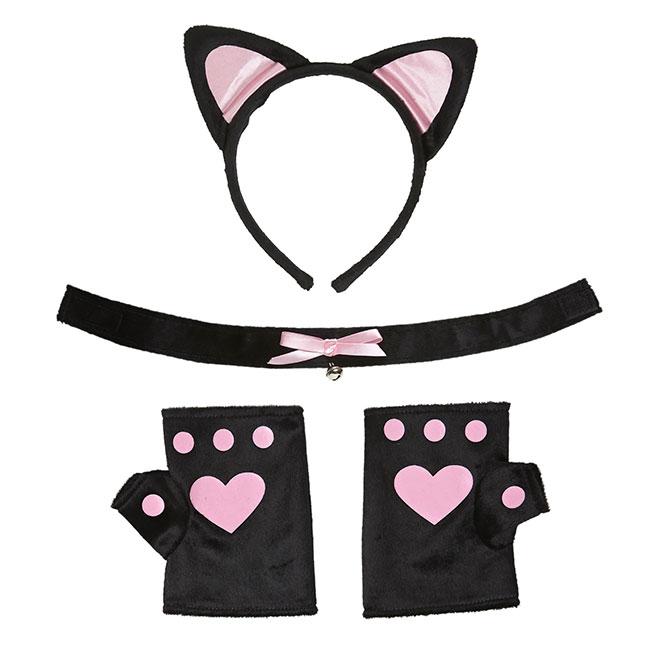 Dieses süße Kitty Cat Set wird 4-teilig geliefert und besteht aus einem Haarreifen mit Öhrchen, zwei Handschuhen mit freien Fingern und einem Halsband. Die Artikel sind in schwarz und Rosa gehalten. Dazu kann einfach schwarze Kleidung wie ein Rock und ein Top getragen werden - MIAU!