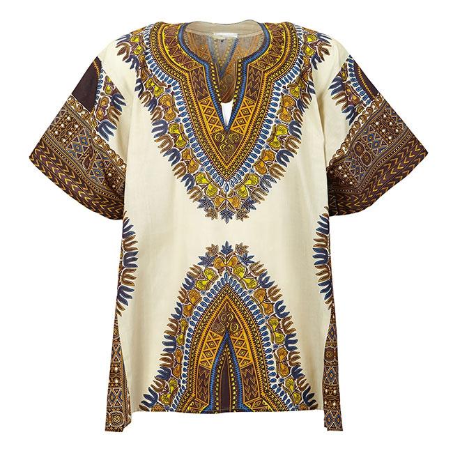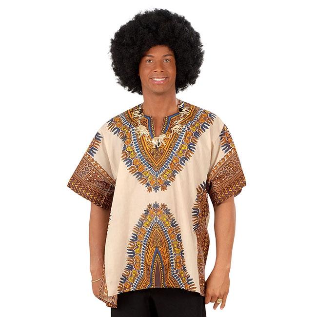 Das T-Shirt "Afrika" ist passend für die Größen M/L. Das beigefarbene Oberteil wird von braun-gelben, orientalisch-afrikanischen Mustern durchzogen. Ein enger V-Ausschnitt findet sich am Hals.