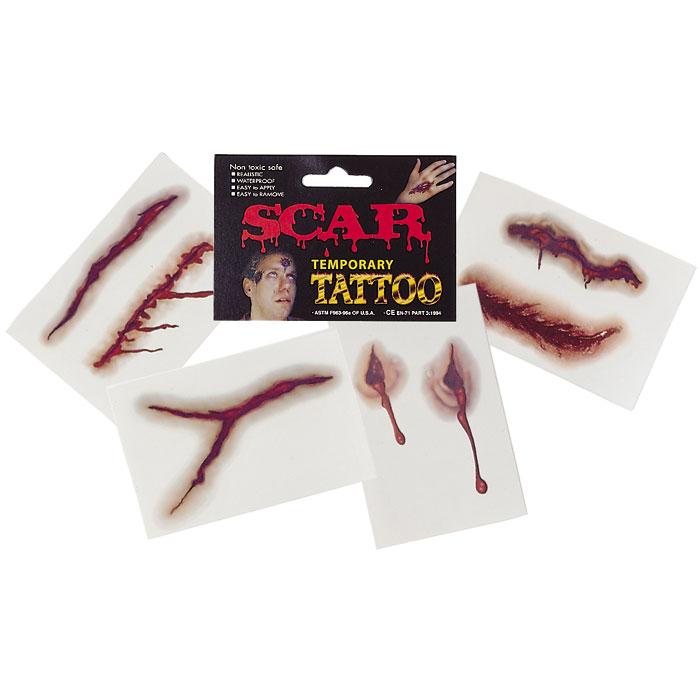 Mit diesem Narben-Set machen Sie sich selber ganz leicht zum armen, verletzten Partygast. Genau das richtige für die kommende Halloween- oder der Horror-Party. Was möchten Sie sein? Unfallopfer? Opfer des Monsters aus Scream? Oder vielleicht haben Sie gerade eine Begegnung mit dem Massaker-Man gehabt? Wir sind uns sicher, dass Sie sich diese Tattoos schon für das richtige Kostüm aussuchen und wünschen Ihnen viel Spaß! Einfach das Tattoo auf die Haut legen, mit einem feuchten Schwamm solange befeuchten, bis sich das Papier von selber löst.
