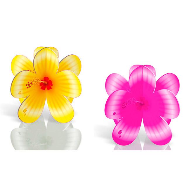 Die Tischaufsteller "Hibiskusblüten" sind zu 4 Stück abgepackt und bestehen aus den Farben Gelb und Pink. Die Aufsteller sind aus dickerer, robusterer Pappe gefertigt und sind in Form von Hibiskusblüten gehalten.