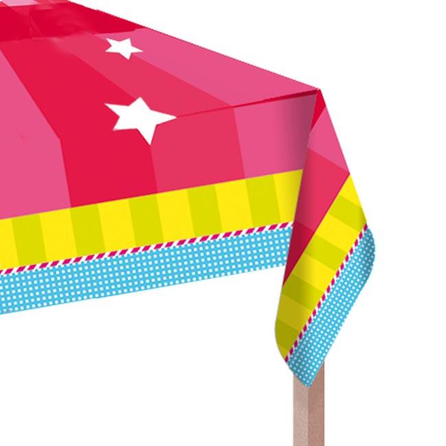 Diese kunterbunte Tischdecke aus wetterfester Folie macht direkt gute Laune! Sie besteht aus vielen schönen Farben und Mustern und eignet sich für jede Party. Der Rand der Tischdecke ist hellblau und hat weiße Punkte. Die obere Ebene ist grün/gelb gestreift. Und der größte Teil der Tischdecke ist rot und mit weißen Sternen bedruckt. Die Tischdecke hat eine Breite von ca. 130 cm und eine Länge von ca. 180 cm.
