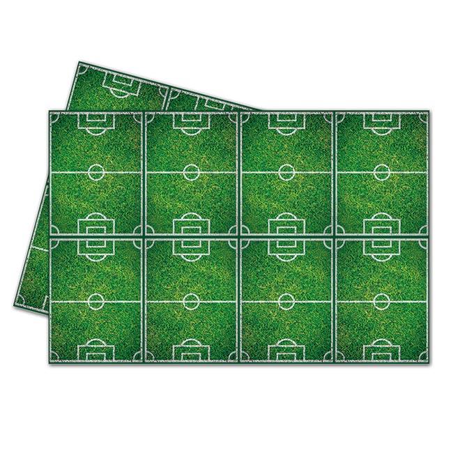 Die Tischdecke "Fußball Leidenschaft" ist ca. 120 x 180 cm groß und besteht aus einseitig bedruckter Kunststofffolie. Das Motiv besteht aus den typischen weißen Spielfeldmarkierungen und realistischem Rasen-Druck. Insgesamt sind 2 x 4 Fußballfelder dargestellt.