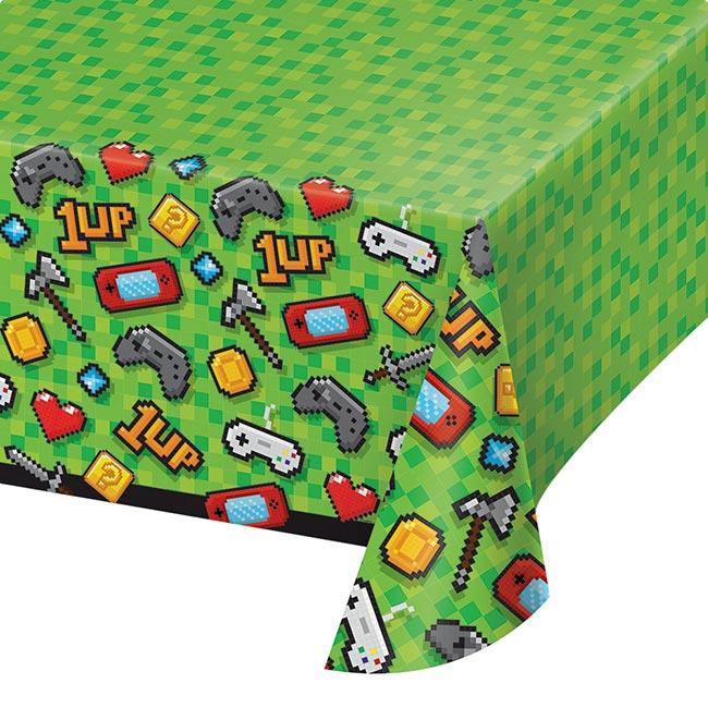 Die Tischdecke "Gaming Party" besteht aus einseitig bedruckter Kunststofffolie und ist ca. 137 x 259 cm groß. Während die komplette Tischdecke mit Pixeln in verschiedenen Grüntönen bedruckt ist, ist der Rand mit diversen pixeligen Motiven aus dem Videospieluniversum bedruckt (Schwert, Axt, Controller ect.). Dank dem Material, können kleinere Missgeschicke schnell mit einer Serviette oder einem Tuch weggewischt werden.