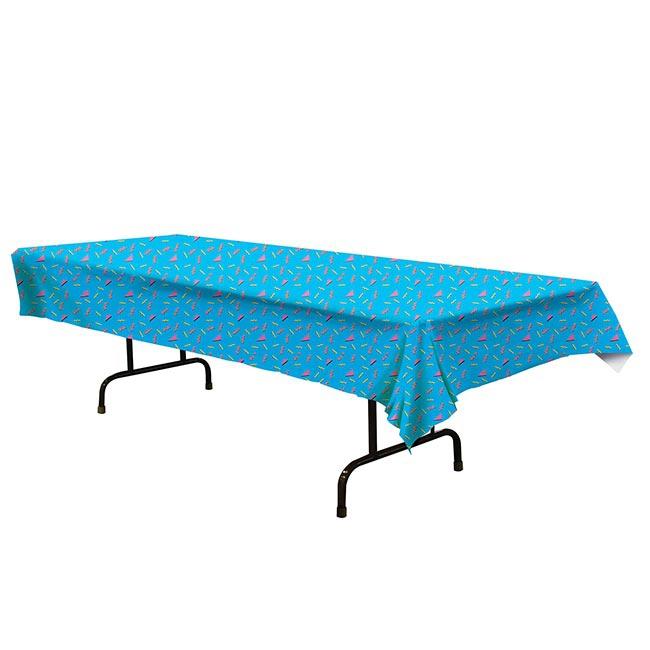 Die Tischdecke "I love the 90s-Party" besteht aus einseitig bedrucktem, 100%igem Polyethylen und hat eine Größe von ca. 1,37 x 2,74 m. Sie ist hellblau und mit bunten Retro-Motiven aus den 90ern bedruckt.