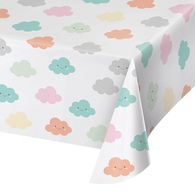 Die Tischdecke "Kleiner Sonnenschein" besteht aus Kunststoff. Sie ist mit vielen kleinen Wolken in verschiedenen Farben bedruckt. Die Größe beträgt ca. 137 x 259 cm.