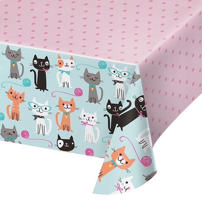 Die Tischdecke "Kleines Kätzchen Kitty" ist ca. 137 x 259 cm groß und besteht aus einseitig bedruckter Kunststofffolie. So kann man kleine Missgeschicke einfach wegwischen. Die Mitte der Tischdecke ist rosa und mit Punkten in einem dunkleren Rosa verziert. Der Türkise Rand ist mit einer ganzen Schar niedlicher Katzen bedruckt.