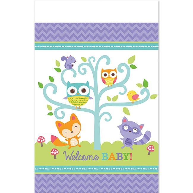 Die Tischdecke "Süße Waldbewohner" besteht aus Kunststoff und hat eine Größe von ca. 137 x 259 cm. Sie ist bedruckt mit niedlichen Bewohnern des Waldes und dem Schriftzug "Welcome Baby!".