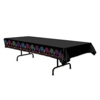 Die Tischdecke "The Day of the Dead" besteht aus 100% Polyethylen hat eine Größe von ca. 137 x 274 cm. Sie ist überwiegend schwarz und zeigt am Rand ein Muster im Stil des "Día de los Muertos". Bunte Blumen und Schädel kommen auf dem schwarzen Hintergrund besonders gut zur Geltung!