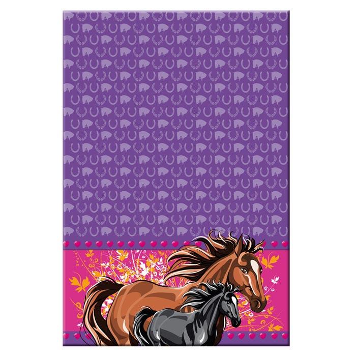 Traumhaft schön und verspielt ist diese Tischdecke, die bei Ihren Kindern bestimmt super ankommt. Da ist es auch mal egal, wenn ein bisschen daneben geht, denn die Tischdecke schützt und ist Dekoration in einem. Der Hauptteil ist lila und mit kleinen Pferdeköpfen und Hufeisen bedruckt, der untere Teil ist pink mit orangen und weißen Verzierungen und als Highlight sind dort 2 tolle Pferde bedruckt. Die Tischdecke ist ca. 130x180 cm groß und besteht aus Kunststoff.