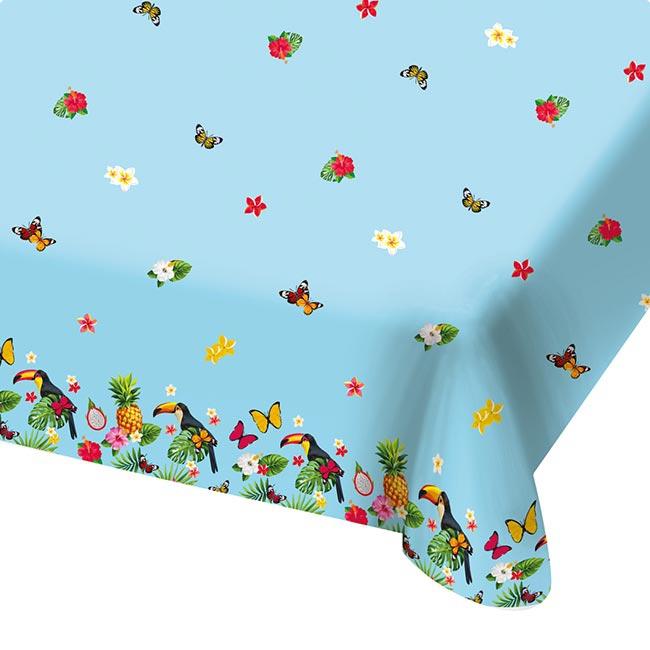 Die Tischdecke "Tropischer Tukan" hat eine Größe von ca. 180 x 130 cm und besteht aus Kunststoff. Daher ist sie besonders pflegeleicht. Sie ist blau und mit Schmetterlingen und Blumen bedruckt. Den Rand zieren mehrere Tukane, Palmenblätter und tropische Früchte.