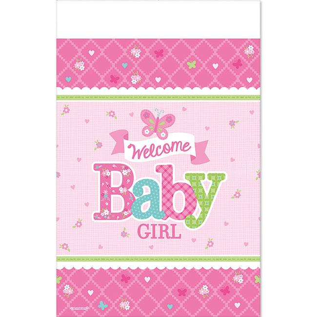 Die Tischdecke "Willkommen Kleines" besteht aus Kunststoff und hat eine Größe von ca. 137 x 259 cm. Sie ist überwiegend rosa und außerdem mit dem Schriftzug "Welcome Baby Girl" bedruckt. Des Weiteren sind auch Herzchen, Schmetterlinge und Blumen auf der Tischdecke zu sehen.