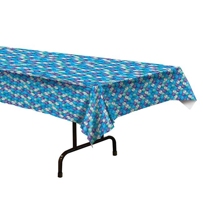 Die Tischdecke "Zauberhafte Nixe" ist einseitig bedruckt und besteht aus 100% Polyethylen. Sie hat eine Breite von ca. 1,37 m und eine Länge von ca. 2,74 m. Die Tischdecke ist mit einem Fischschuppenmuster in Blau-, Lila- und Grüntönen bedruckt.