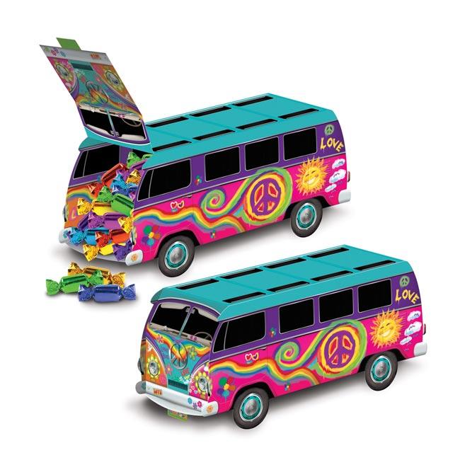 Für eine Flower Power bzw. Hippie-Party ist ein VW Bus als Dekoration einfach unerlässlich. Dieser bunte Tischgefährte ist aus Pappkarton gefertigt und wie eine Schachtel zusammengesteckt. Die Heckklappe kann geöffnet werden, so dient der Bus als ideale Aufbewahrung für Süßigkeiten oder andere leckere Dinge, worüber sich vor allem die Kids freuen werden. Viele weitere Dekorationen für Tische und den ganzen Raum finden Sie bei uns im Online-Shop!