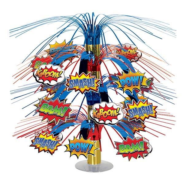 Comic-Fans, aufgepasst! Die Tischdeko "Comic Spaß" ist ca. 46 cm hoch. Sie besteht aus metallischer Folie an deren Enden beidseitig bedruckte Motive in typischer Comic Lautmalerei befestigt sind. Die Fontäne wird einfach in den beiliegenden Ständer gesteckt und kann platziert werden.