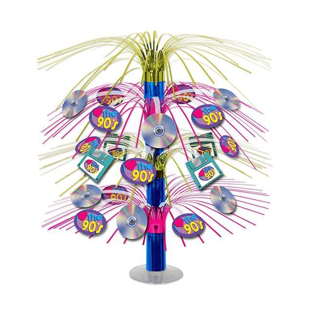 Die Tischdeko Fontäne "I love the 90s Party" hat eine Höhe von ca. 46 cm. Sie wird mit einer Halterung geliefert, so dass sie problemlos aufgestellt werden kann. An den bunten Streifen aus metallischer Folie hängen CD's, Disketten und 90er-Logos aus beidseitig bedrucktem Papier.