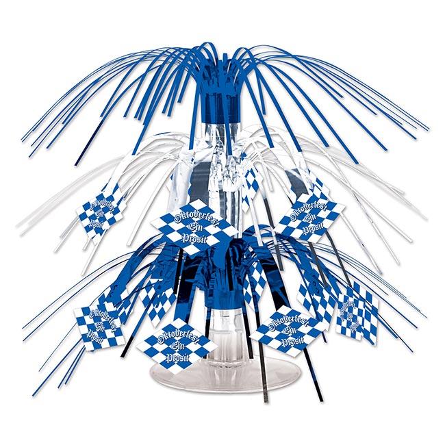 Ein Prosit auf das Oktoberfest! Endlich ist es wieder so weit, packt das Dirndl und die Trachten aus und schunkelt zu toller Volksmusik! Diese Tischdeko hat eine Höhe von ca. 19 cm und wird in eine Halterung aus Kunststoff gesteckt. Die Tischdeko sieht aus wie eine Fontäne, an welcher Fransen aus blauem und weißem Lametta befestigt sind. Außerdem befinden sich Rauten aus blau-weiß kariertem Muster aus Pappe an den Fontänen, auf denen "Oktoberfest ein Prosit" steht.