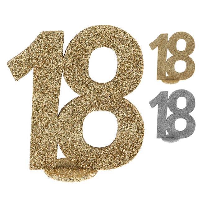 Die Tischdeko "Funkelnde 18" besteht aus Plastik und Glitzer und hat eine Größe von ca. 10 x 10 cm. Sie ist in den Farben Gold und Silber verfügbar.