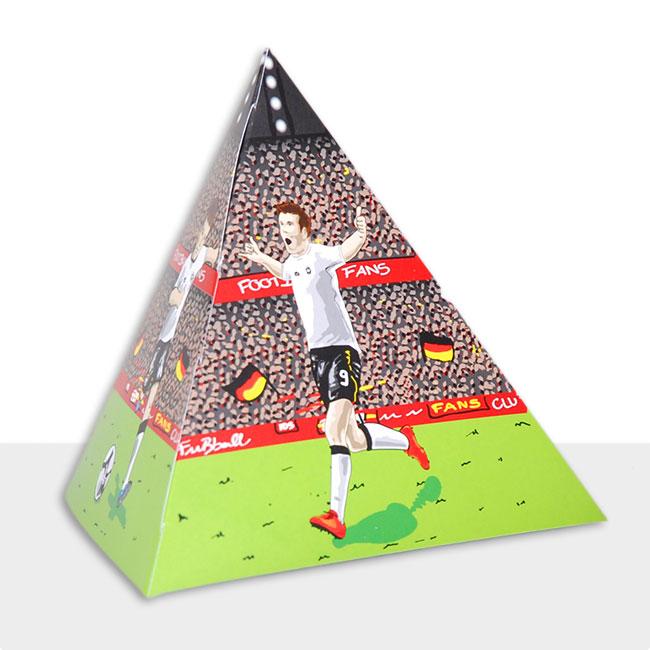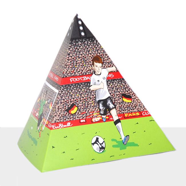Mehr Info: Die Pyramide hat auf jeder Fläche ein eigenes Motiv. Im Hintergrund ist immer ein Stadion zu sehen mit vielen Zuschauern. Vorne sieht man Fußballspieler und einen Torwart der einen Ball fängt. Die Trikots der Spieler sind weiß, natürlich passend zu Deutschland!