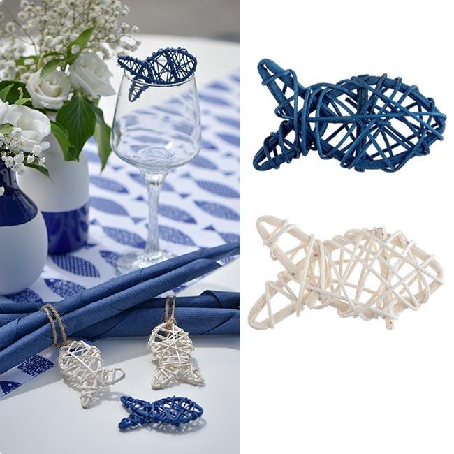 Die Tischdeko "Meeresbrise" wird im 4er Pack geliefert und besteht aus Rattan. Pro Packung sind jeweils vier ca. 6,5 x 4 cm große Fische enthalten. Je nach Auswahl kann zwischen den Farben Blau oder Weiß gewählt werden.