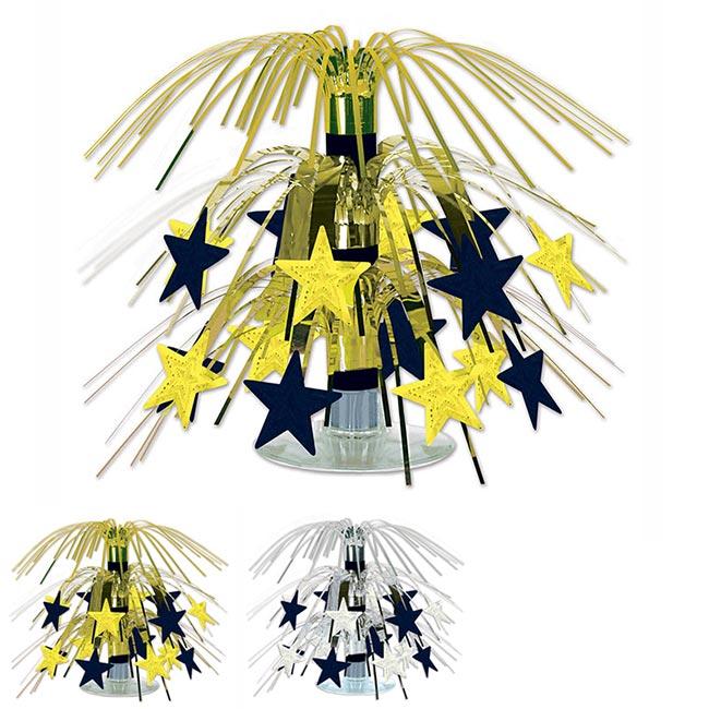 Die Tischdeko Mini-Fontäne "Funkelnde Sterne" hat eine Höhe von ca. 19 cm. Sie besteht aus metallischer Folie und wird mit einer Halterung aus Kunststoff geliefert, sodass die Fontäne problemlos aufgestellt werden kann. Je nach Auswahl ist die Fontäne schwarz-gold oder schwarz-silberfarben.
