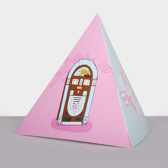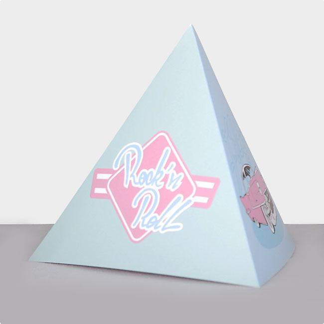 Let´s fetz! It´s Rock´N´Roll Time! Mit dieser Tischdeko Pyramide hat man eine super Deko für eine 50er Jahre Mottoparty. Die Pyramide besteht aus Pappe und wird ganz einfach zusammengefaltet. Sie hat eine Höhe von ca. 13,5 cm und besteht aus drei unterschiedlichen Flächen mit verschiedenen Motiven. Auf einer Fläche befindet sich ein pinker Cadillac, auf der anderen Seite befindet sich eine Jukebox und auf der letzten Seite befindet sich ein Symbol mit "Rock´N´Roll". Geliefert werden die Pyramiden im 5er Pack.