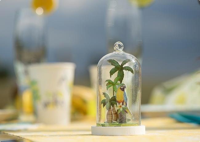 Die Tischdeko "Sommer im Glas" hat eine Höhe von ca. 10 cm. Auf einem Holz-Standfuß mit einem Durchmesser von ca. 5,8 cm befinden sich 3 Palmen und 1 Papagei, ebenfalls aus Holz, unter einer Glaskuppel. Die Tischdeko kann mithilfe des eingearbeiteten Hakens auch problemlos im Raum aufgehängt werden. Die Glaskuppel hat einen Umfang von ca. 15,5 cm.