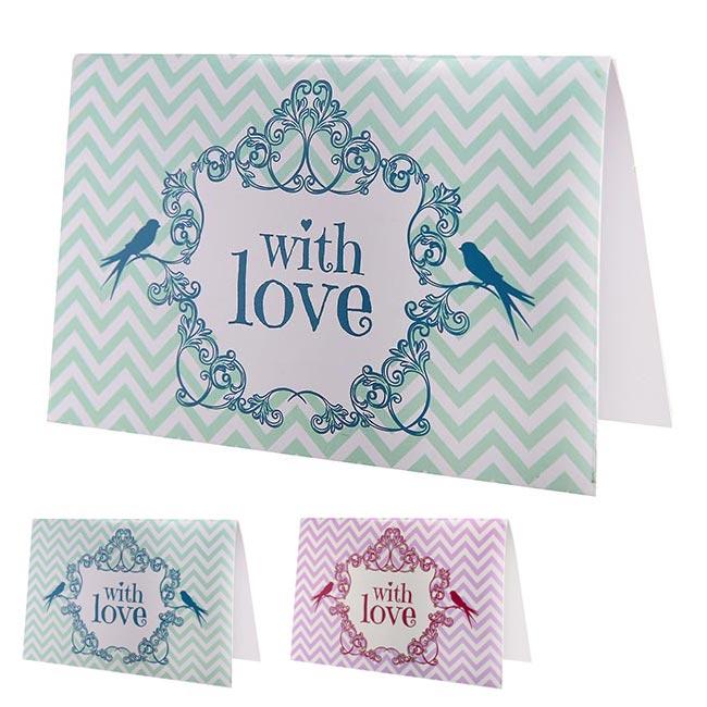Die Tischkarten "With love" werden im 6er Pack geliefert und bestehen aus Pappe. Aufgestellt haben sie eine Größe von ca. 17 x 11 cm und zeigen von beiden Seiten ein hübsches Muster mit der Aufschrift "With love". Die Innenseite ist unbedruckt - daher können Sie die Tischkarten auch als Einladungskarten verwenden. Je nach Auswahl sind sie mint-grün und weiß oder rosa und weiß gestaltet.