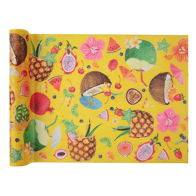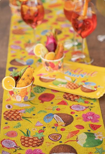 Der Tischläufer "Cocktail Party" ist aus Polyester gefertigt. Er ist ca. 30 cm breit und hat eine Gesamtlänge von ca. 5 m. Als Motiv zeigt er tropische Früchte, die teilweise sogar zu "Cocktail-Gläsern" umfunktioniert wurden, vor einem knallgelben Hintergrund.