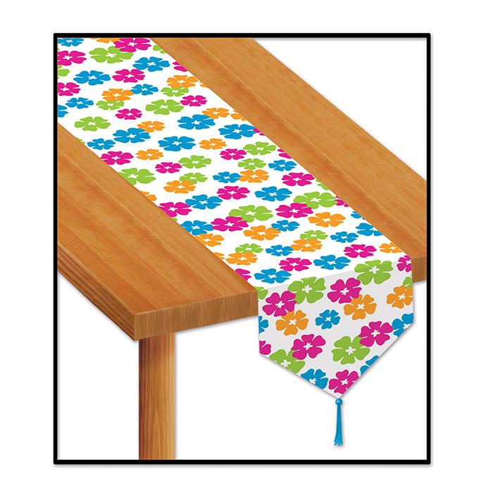 Der Tischläufer "Hawaii" ist ca. 1.83 Meter lang. Gezeigt sind auf weißem Hintergrund bunte - für Hawaii typische - Hibiskusblüten. An beiden Enden, welche spitz zulaufen, findet sich eine Kordel.