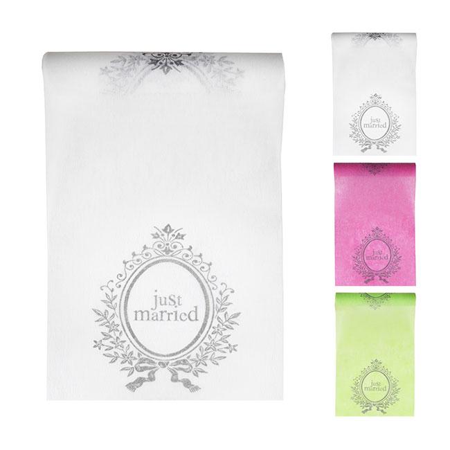 Der Tischläufer "Just Married" hat eine Länge von ca. 5 m und eine Breite von ca. 30 cm. Der aus Vliespolyester hergestellte Tischläufer trägt mit Verschnörkelungen den Aufdruck "Just Married" und ist in den Farben Weiß, Grün und Pink bestellbar.