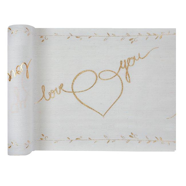 Der Tischläufer "White Wedding" besteht aus Baumwolle, ist überwiegend weiß und mit filigranen Ästen, Herzen und "Love you"-Schriftzügen bedruckt. Diese schimmern sogar metallisch in der Farbe Gold. Die Gesamtlänge beträgt ca. 3 m. In der Breite misst er ca. 30 cm.