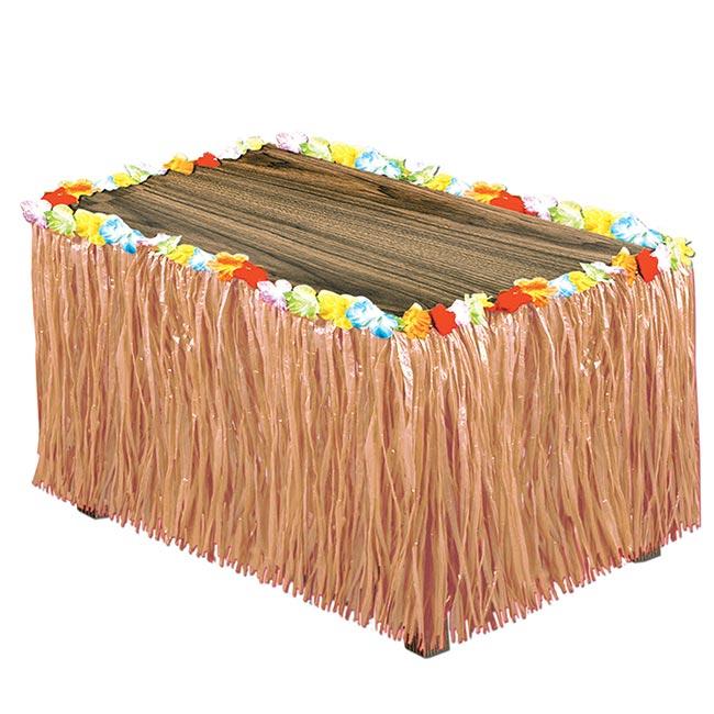 Die Tischverkleidung in Bast-Optik ist insgesamt ca. 2,7 m lang und ca. 76 cm hoch. Sie besteht aus Kunststoff und ist zusätzlich am oberen Saum mit bunten, künstlichen Blüten versehen.