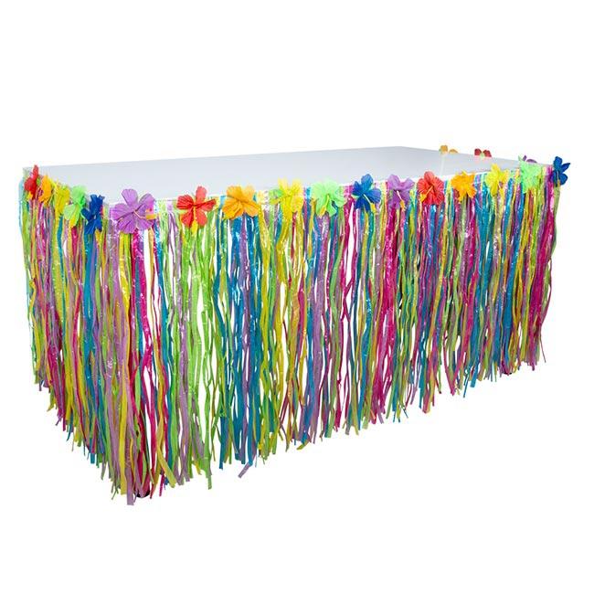 Die Tischverkleidung "Buntes Hawaii" ist ca. 300 cm lang und ca. 75 cm hoch. Perfekt um Getränkekisten oder anderen Nachschub einfach unter dem Tisch zu verstecken. Die langen Fransen bestehen aus buntem Kunststoff und sind am oberen Ende mit einer verstärkten Kante vernäht. Hibiskusblüten aus Polyester unterstreichen den Hawaii-Look. Die Tischverkleidung lässt sich einfach mit doppelseitigem Klebeband befestigen.