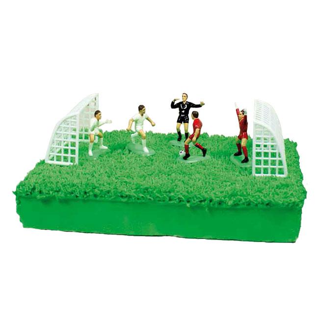 Dieses Set ist aus Kunststoff gefertigt und besteht aus 7 Teilen: 2 Tore, weil ohne Tore kann man kein Fußball spielen. 4 Feldspieler (ein Spieler davon mit Ball am Fuß) und einem Schiedsrichter, die dem Kuchen den letzten Schliff verleihen. Ein Team spielt in rot, das andere in weiß! Viel Spaß beim Backen, Schenken und Bestaunen.