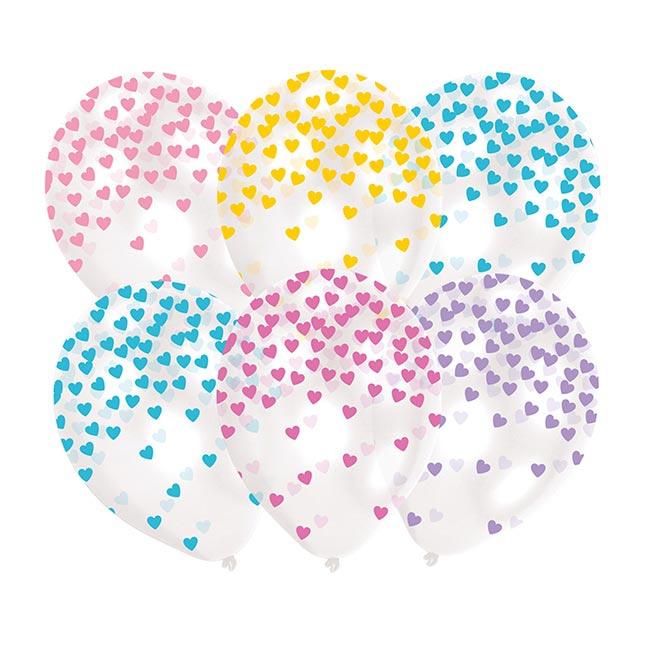 Die transparenten Luftballons "Herzensangelegenheit" bestehen aus Naturkautschuklatex und werden im 6er Pack geliefert. Durch die kleinen aufgedruckten Herzchen, bekommen die Ballons einen charakteristischen Konfetti-Look. Die Herzchen haben die Farbe Gelb, Rosa, Pink, Lila und Blau, wobei Blau zweimal vorhanden ist. Nach dem Aufblasen erreichen die Ballons einen Durchmesser von ca. 27,5 cm.