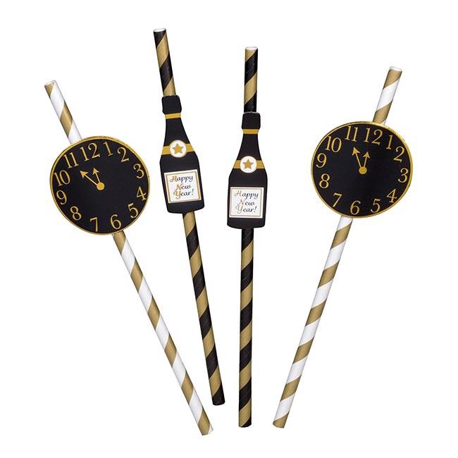 Die dekorativen Trinkhalme "Happy New Year" werden im 10er Pack geliefert. Sie sind in je fünf weiß-goldene und fünf schwarz-goldene aufgeteilt. An den schwarz-goldenen ist eine Sektflasche befestigt, an den weiß-goldenen eine Uhr, die kurz vor Mitternacht anzeigt.