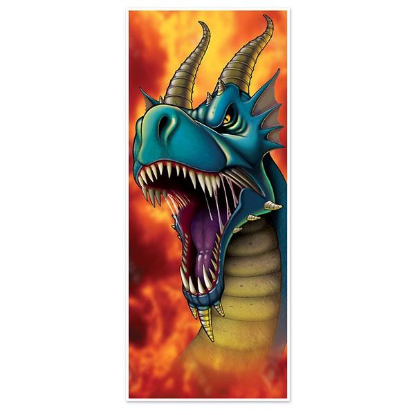 Die Türdeko "Fabelhafte Fabelwesen" hat eine Länge von ca. 183 cm und ist ca. 76 cm breit. Sie besteht aus einseitig bedruckter Kunststofffolie und zeigt einen angriffslustigen Drachen vor einem Feuer. Das Produkt ist nicht selbstklebend, kann aber mit Hilfe von Stripes oder Klebeband an der jeweiligen Tür befestigt werden.