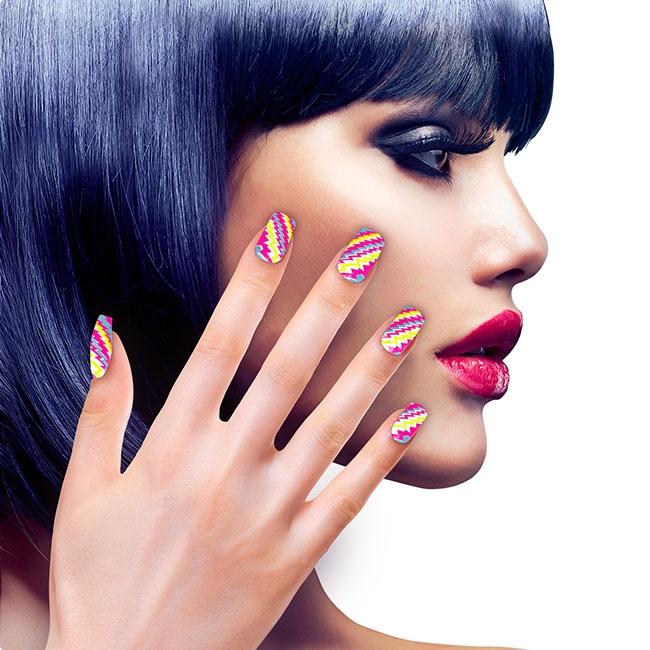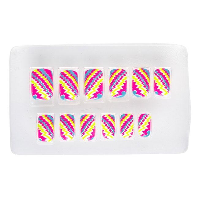 Die künstlichen UV Leucht-Fingernägel "Neon Streifen" sind auf der Rückseite bereits mit einer Haftschicht versehen. Pro Packung sind 12 Fingernägel in 7 verschiedenen Größen enthalten. Wie der Name bereits verrät, leuchten neonfarbenen Zick-Zack Streifen unter UV-Licht.