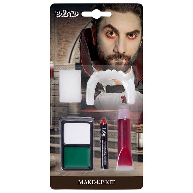 Das Vampir-Set beinhaltet genau die richtigen Dinge für ein Vampir-Dasein an einem besonderen Tag. Zum Inhalt gehört 2 x 1 g Fettschminke in Grün und Weiß fürs Gesicht, 1 x 1,6 g Schminkstift in Rot, 1 x 3,5 ml Theaterblut, 1 x Schwamm und 1 x Zähne.